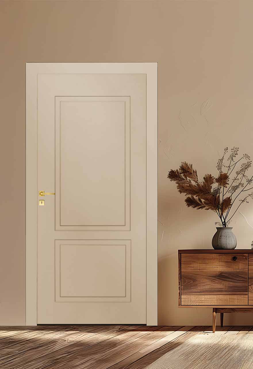 La porte intérieure AUTHENTIQUE incarne le charme classique revisité avec sobriété. Son esthétique à deux panneaux moulurés, subtilement travaillés, apporte du relief et du caractère tout en conservant une grande simplicité visuelle. Elle s’intègre aussi bien dans des ambiances traditionnelles que contemporaines.